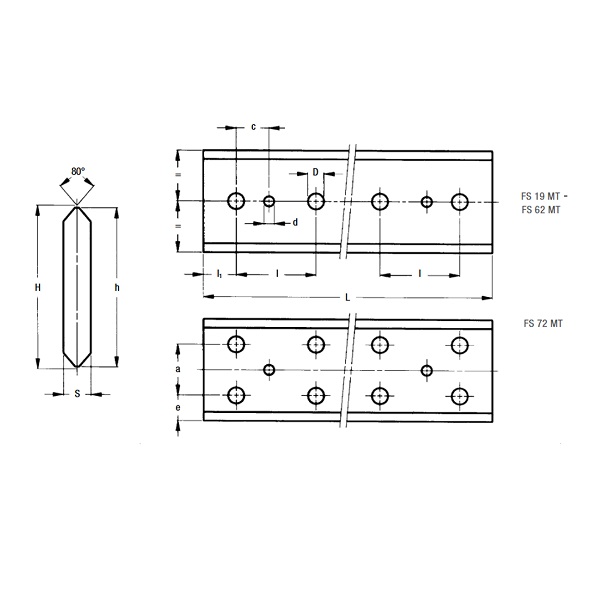 Rostbeständige Führungsschiene FS.., kaltgezogen, mit induktiv gehärteten und geschliffenen Laufflächen (M) in 80° Winkel, Befestigungsbohrungen: standard - einreihig - mittig platziert (SB), Nadella